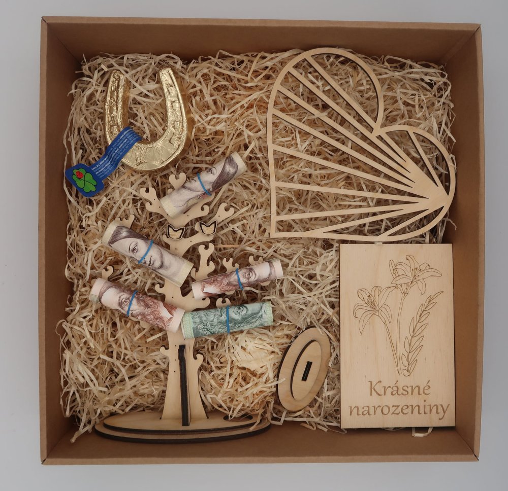 Dalším perfektním dárkovým balíčkem je paleta čokolády s vyřezávaným dřevěným srdcem Jsi můj poklad, ale lze koupit i samotnou paletu čokolády, s gravírovaným vzkazem. V neposlední řadě jsou jistě jedinečným dárkem dárkové balíčky s naším dřevěným stromem na šperky (s čokoládovou podkovou, dřevěným přáním a dřevěným srdcem). Ten pokud objednáte i s dřevěnými šperky (např. dřevěné náušnice pecky), vytvoříte dárek, který ohromí. Obzvlášťě ženám, které mají rády jedinečný šperk, který jen tak někdo nemá.