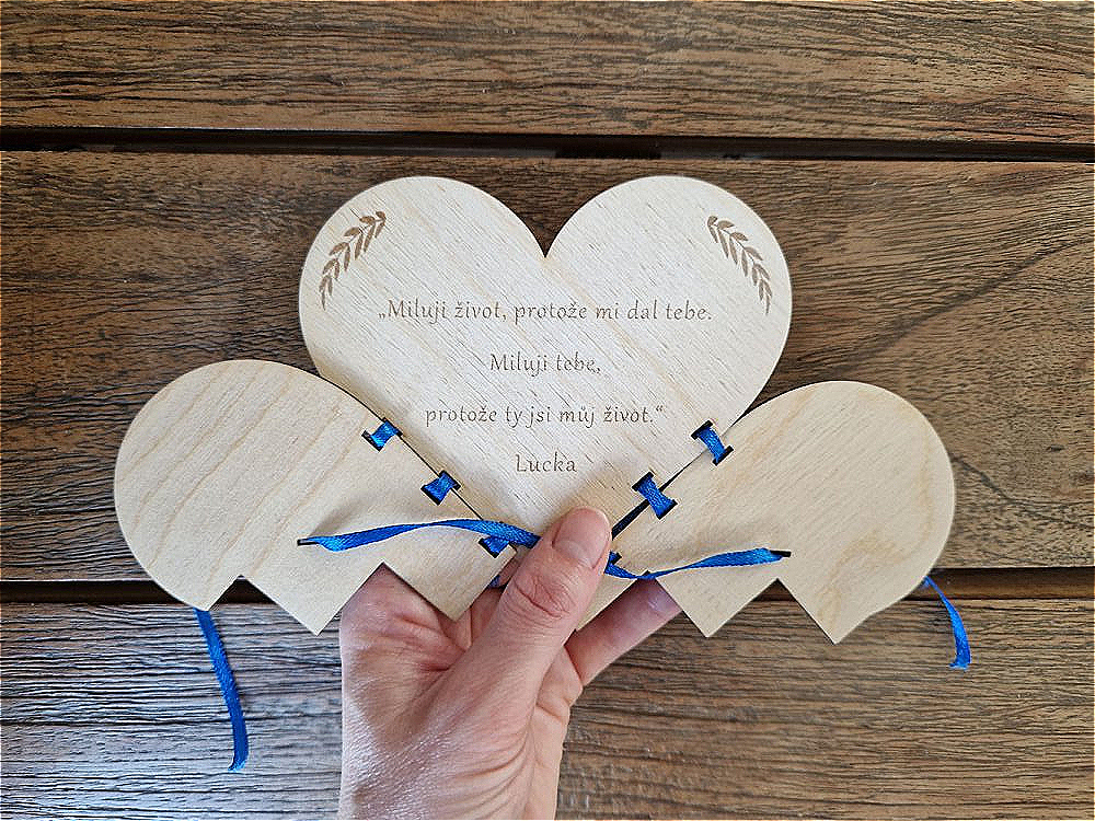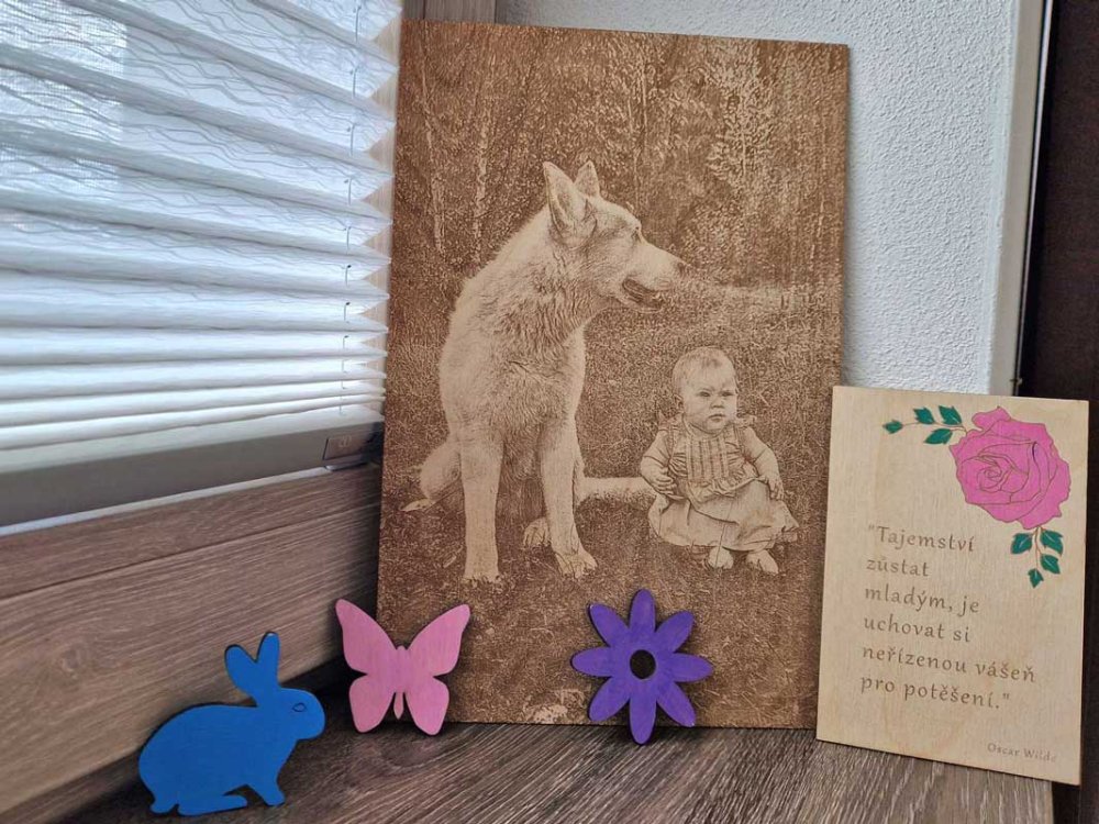 Představte si dárek, který je jedinečný. Stejně tak jako ten, koho máte rádi. Představte si dárek se vzkazem, přáním, citátem,... Texty nebo fotky vryjeme nesmazatelně pod povrch dřeva, a tak se z nich bude obdarovaný těšit dlouhá léta. Může si je vystavit a mít tak milou vzpominku vždy na očích. A pokud se je rozhodne schovat nebo přestěhovat, nezmačkají se. Budou stejné dnes jako zítra, za měsíc, za rok, ale i po letech.