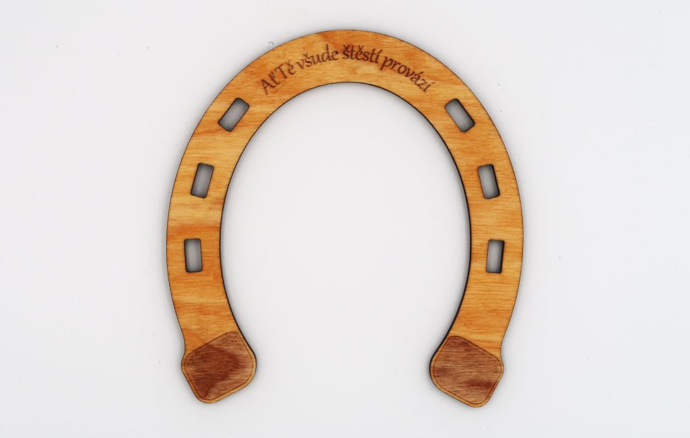Dřevěnou podkovu vyrábíme z 4 mm březové překližky. Rozměr podkovy dřevěné je cca 120 x 115 mm (12 x 11,5 cm).