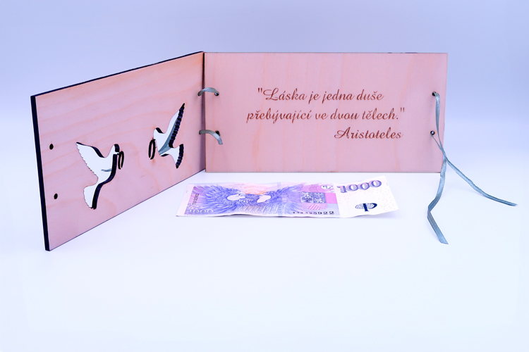 Uvnitř přání (po vyjmutí bankovky) je gravírovaný text. Ten si můžete zvolit jakýkoliv si budete přát. Vyberte jej z citátů níže nebo nám pošlete text vlastní. Gravírovaný text nám jednoduše napište do kolonky vlastní text.