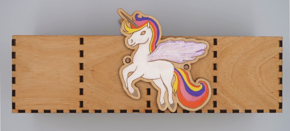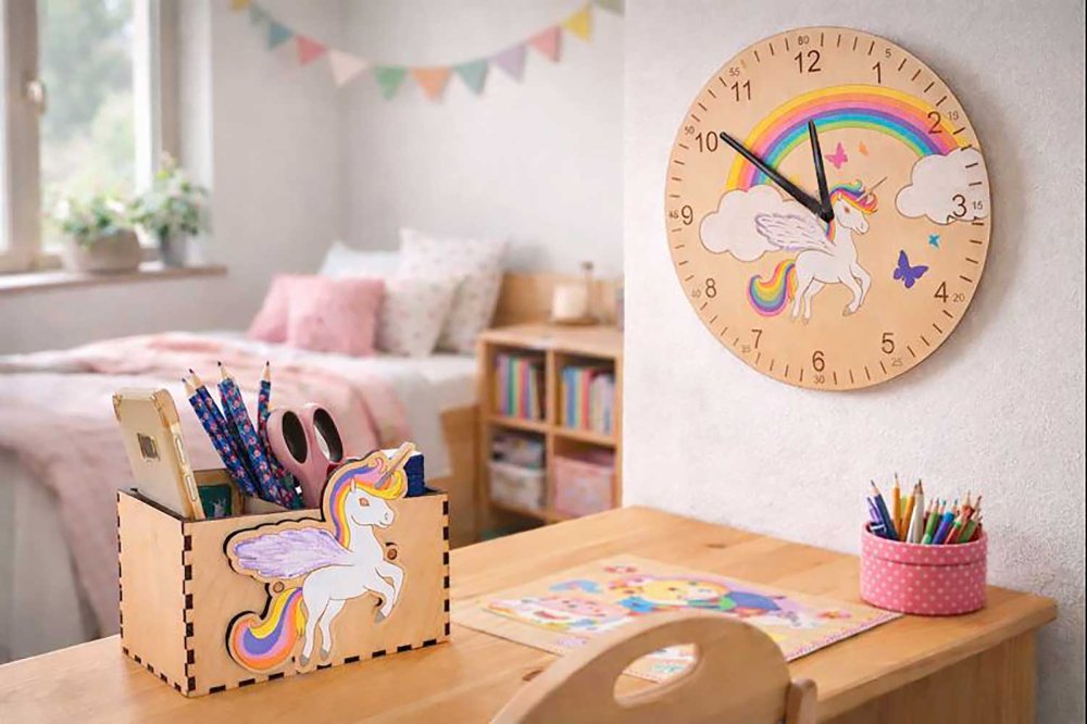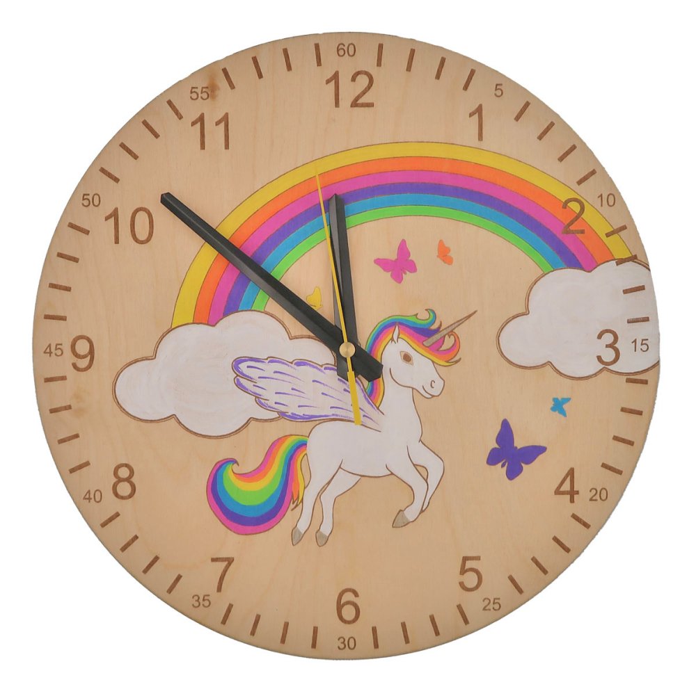 K pastelkovníku doporučujeme přikoupit dřevěné hodiny s jednorožcem, na kterých je stejná kresba barevného jednorožce, duha a motýlci.