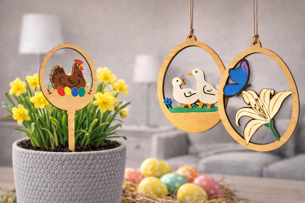 Vytvořte útulnou sváteční atmosféru plnou vůně mazance, jarních květin a společných chvil s rodinou i přáteli. Precizně vyřezávané dřevěné ozdoby v několika motivech jemně doplní Váš interiér a podtrhnou kouzlo Velikonoc.